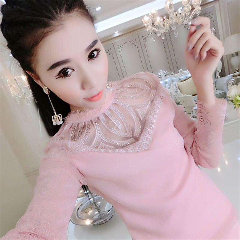 歐洲站2015冬季新款女裝時尚網紗上衣小立領性感燙鉆打底衫 /
