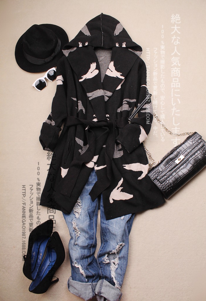 簡介: 貨號14197 產地桐鄉 主圖來源實拍無模特 產品類別大衣 貨源類別現貨 是否庫存否 面料名稱針織 主面料成分棉 主面料成分的含量50(%) 圖案動物 風格歐美 厚薄普通 版型修身型 衣長中長款(65cm<衣長≤80cm) 領型連帽/帽領 袖長長袖 衣門襟系帶 是否有腰帶有腰帶 上市年份/季節2015秋季 顏色黑色,藏青色