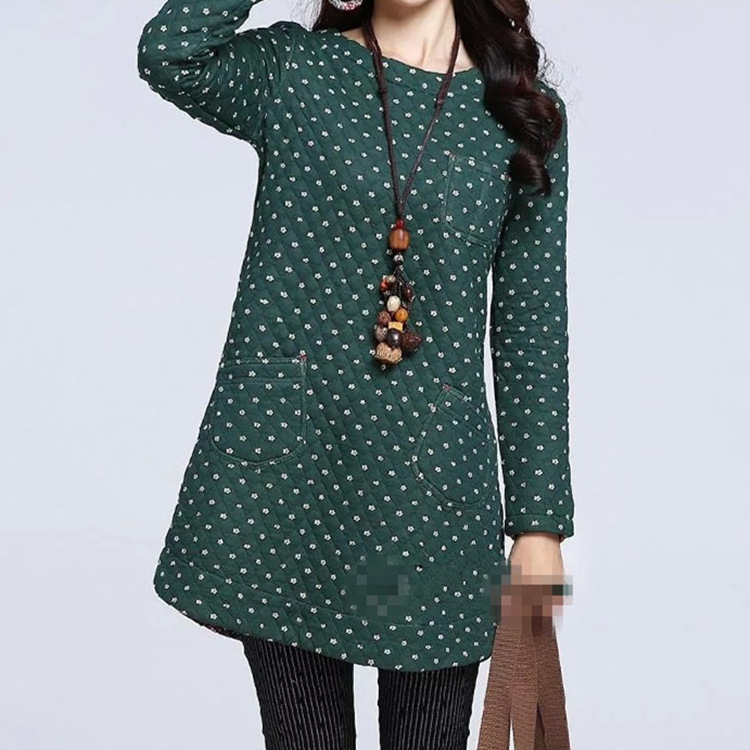 加棉加厚秋冬打底連衣裙韓版圓領(lǐng)中長款碎花顯瘦加厚連衣裙 /