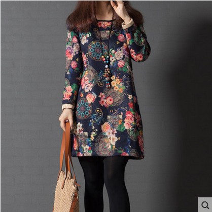 2015秋款新款棉麻女裝 時尚印花大碼寬松顯瘦長袖連衣裙 /