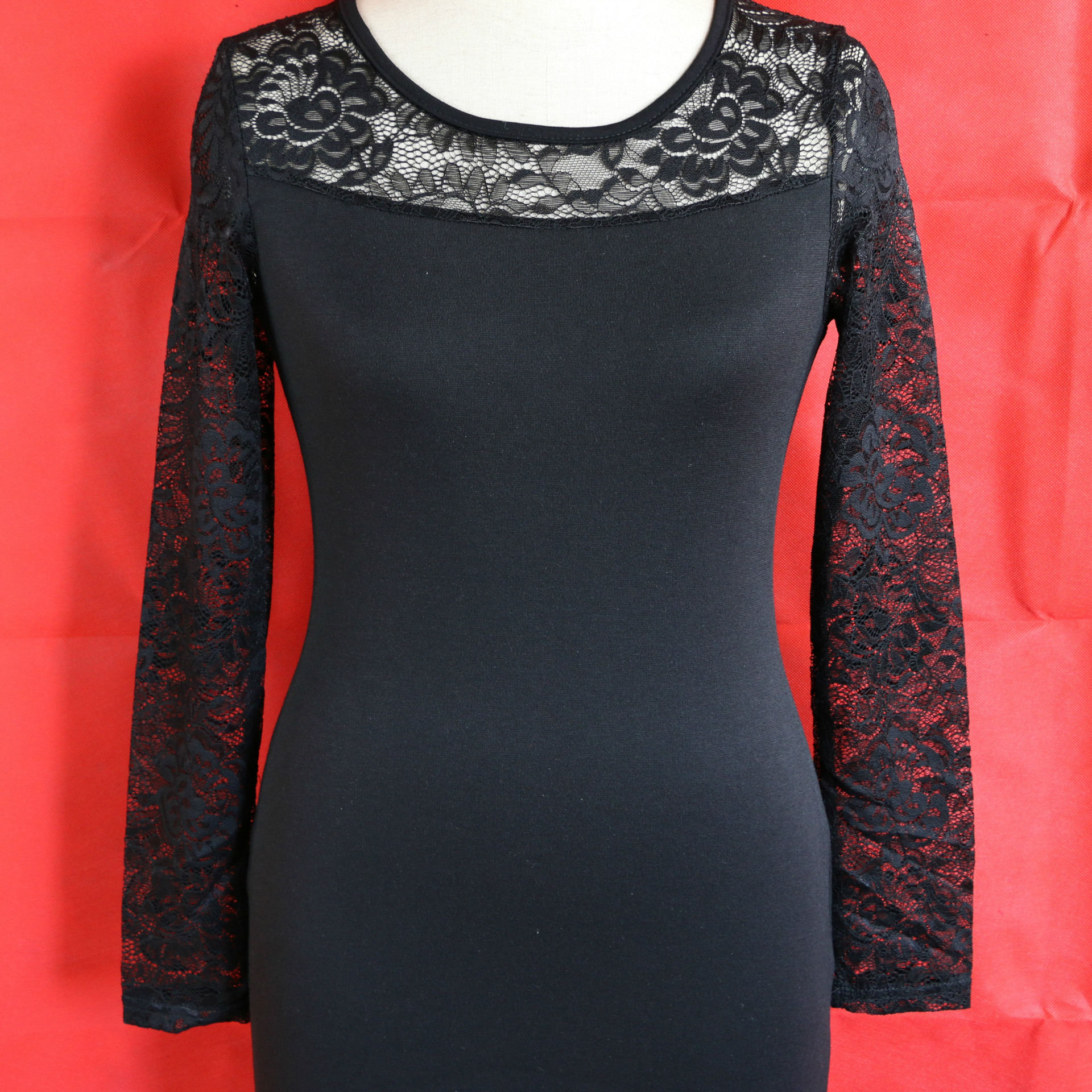 2015新款韓版女裝中長款黑色長袖蕾絲時尚性感裹胸連衣裙廠家批發 /