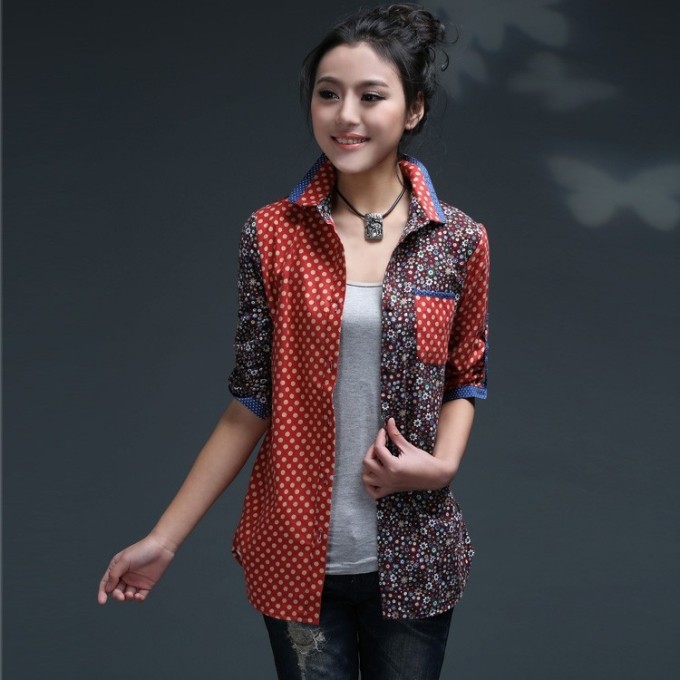 2015秋季韓版復古圓點拼色長袖碎花襯衫韓版全棉波點女士休閑襯衣 /