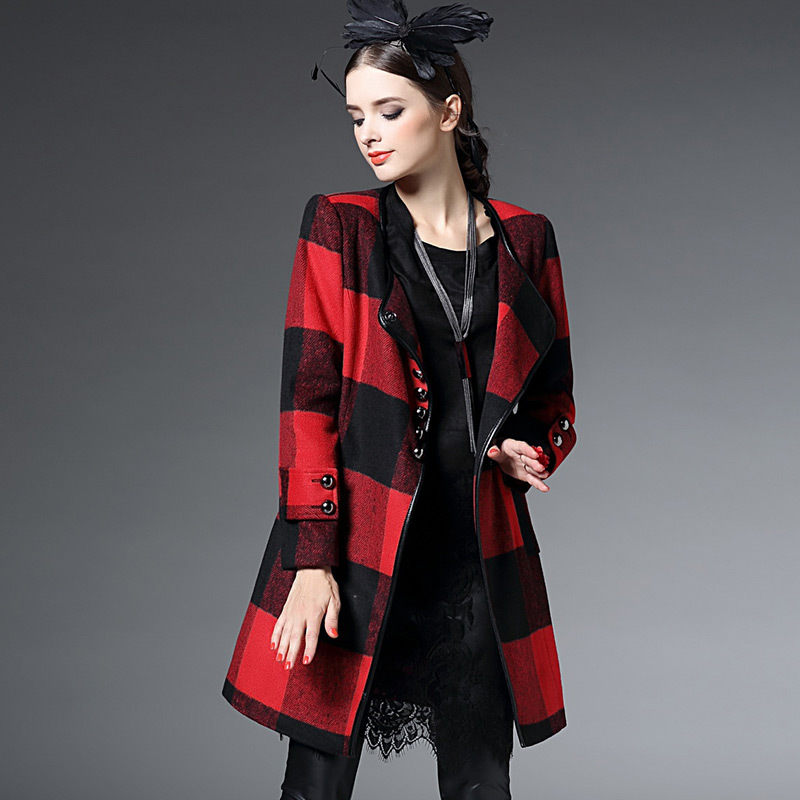 秋冬新款歐美經典格子毛呢外套中長款大衣 /