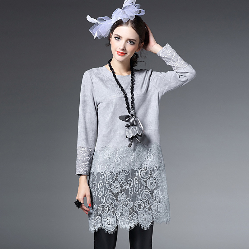 歐洲站2015秋冬精品女裝歐美長袖麂皮絨蕾絲打底衫 /