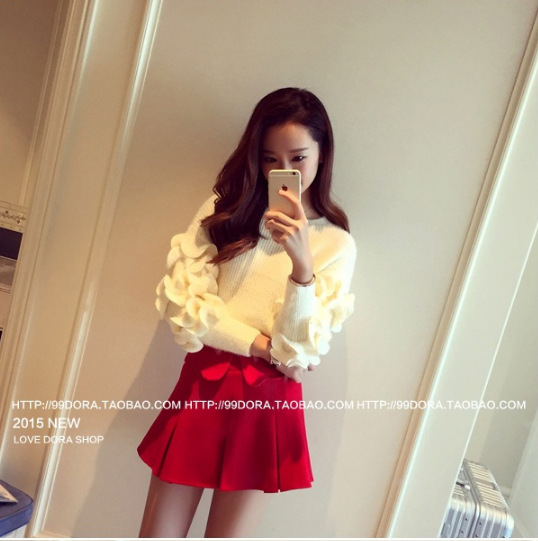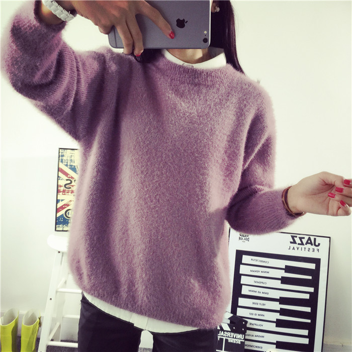 新款秋冬裝套頭木耳邊寬松純色圓領針織衫長袖毛衣女零賣批發 /