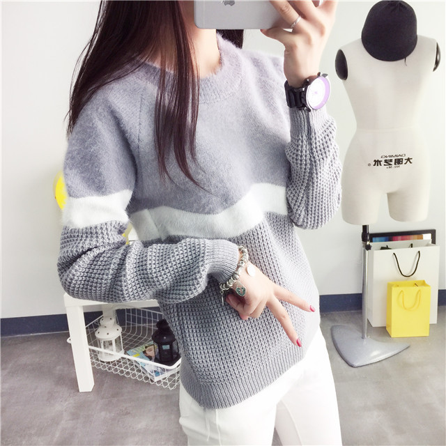 新版韓國半身女式毛衣仿貂絨套頭條紋舒適圓領保暖長袖打底針織衫 /