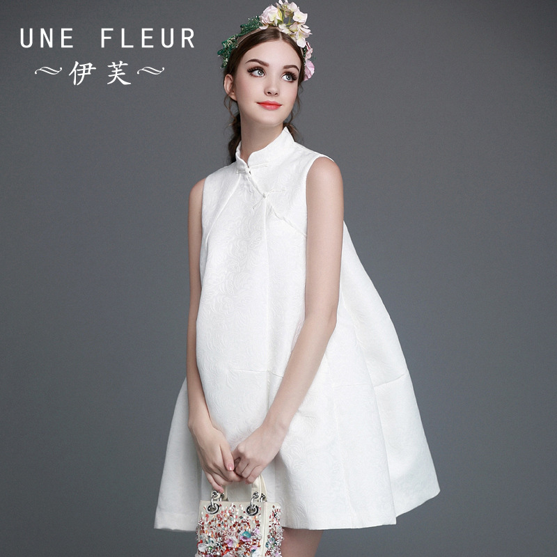 伊芙2015秋季新款歐美女裝短裙無袖女提花盤扣立領寬松A字連衣裙 /