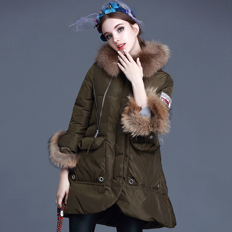 歐美2015秋冬新款女連帽超大毛領毛毛袖口寬松A廓型羽絨服外套 /