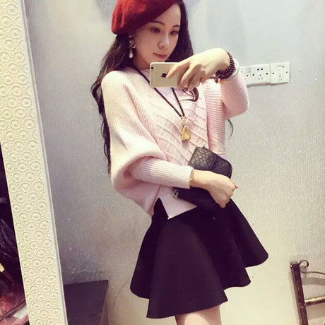 2015歐貨秋裝新款時尚韓版休閑百搭短裙蝙蝠袖毛衣套裝女潮 /