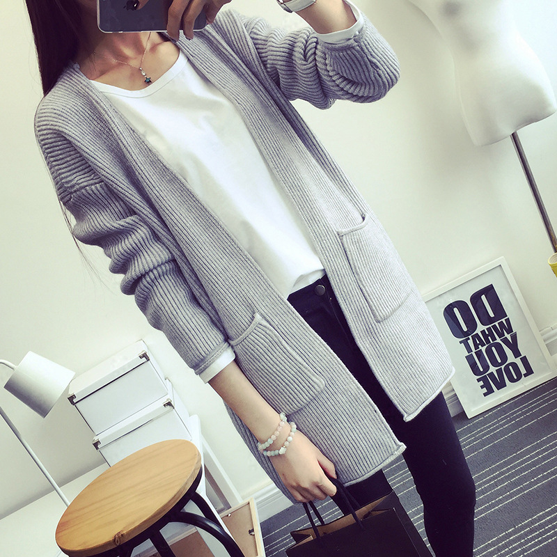 2015新款秋裝女韓版寬松中長款針織開衫女長袖卷邊口袋毛衣女 /
