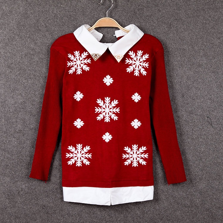 日系女裝襯衫領(lǐng)提花假兩件套頭毛衣女 娃娃領(lǐng)拼接針織衫女打底衫 /