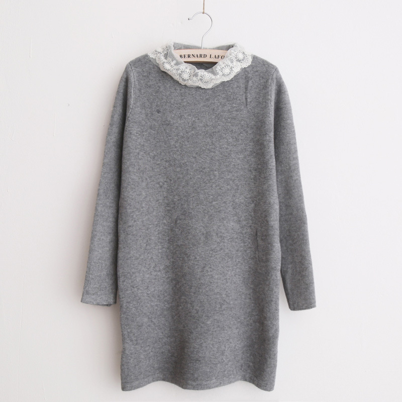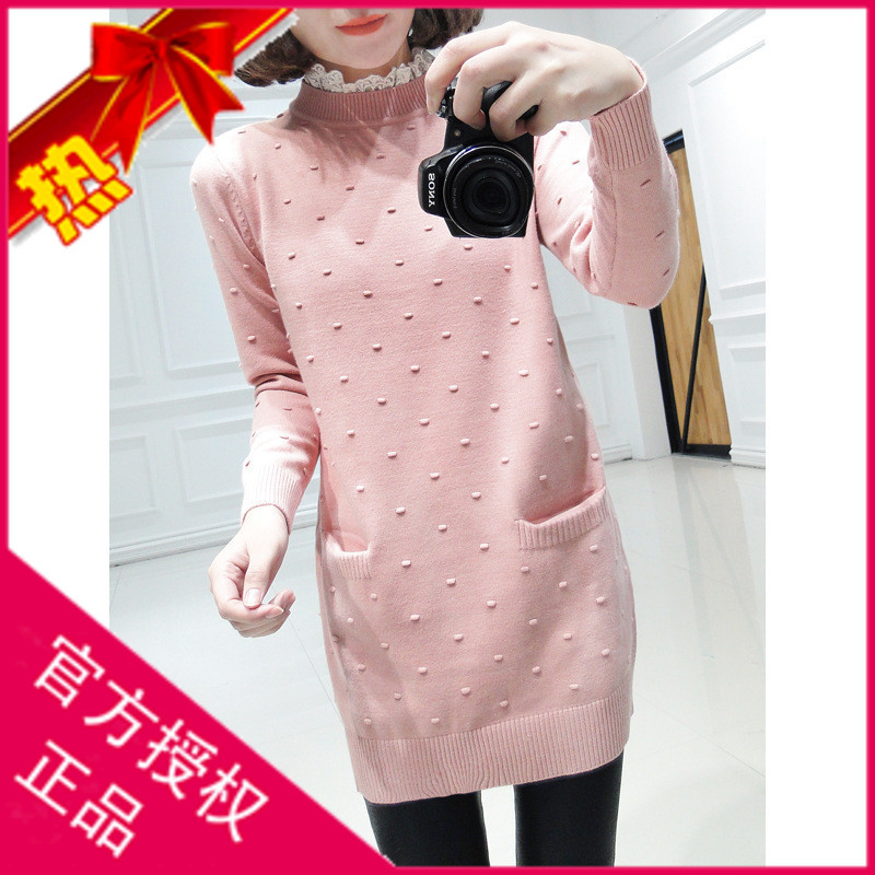 冬裝新款韓版蕾絲花邊領(lǐng)波點修身顯瘦長袖針織衫女打底衫毛衣長款 /