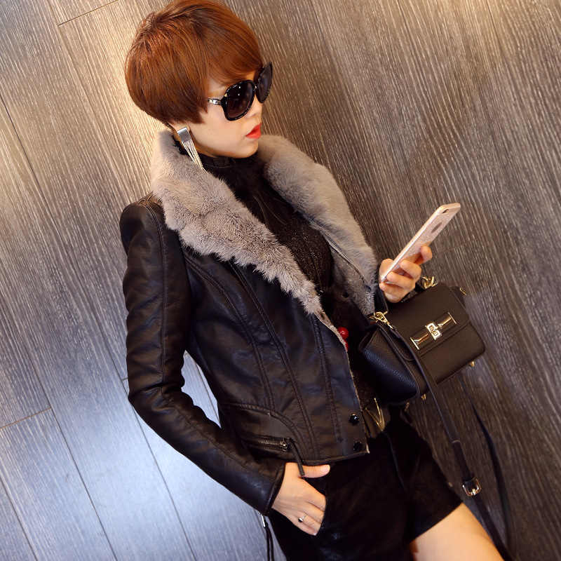 15秋冬新品皮衣女短款pu皮外套韓版顯瘦獺兔真毛領加絨皮外套夾克 /