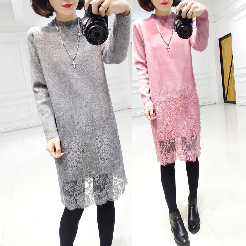 2015冬裝新款女裝韓版圓領針織拼蕾絲純色顯瘦針織打底裙連衣裙 /