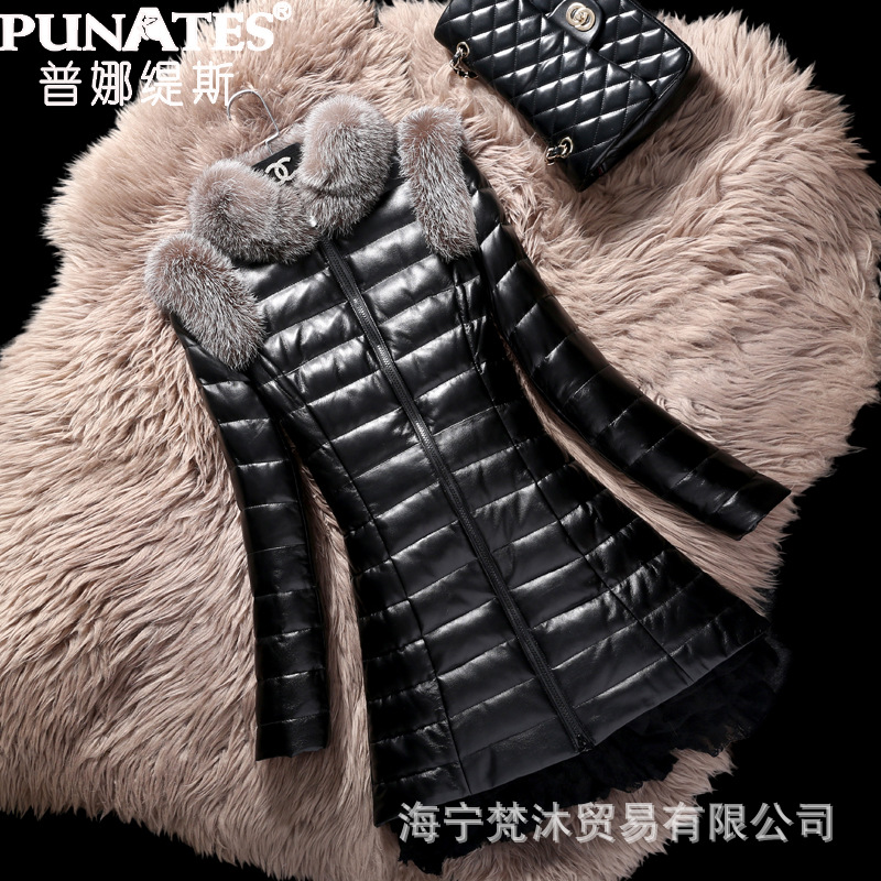 2015新款海寧真皮皮衣女羽絨服狐貍毛領中長款修身綿羊皮女裝外套 /