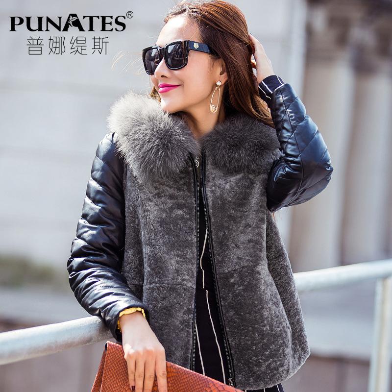 2015新款海寧真皮皮衣羽絨服女短款皮毛一體羊剪絨皮草修身外套 /