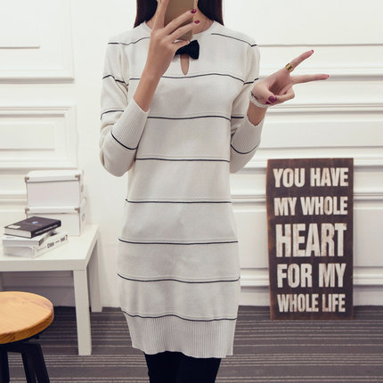 2015新款韓版條紋針織衫圓領,立體蝴蝶結針織衫套頭毛衣女中長款 /