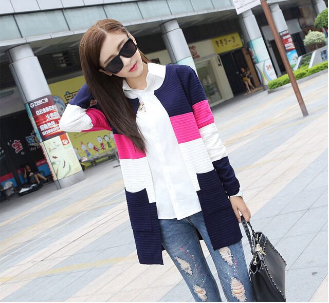 2015秋冬裝新款韓版中長款寬松條紋針織開衫 女裝毛衣外套批發 /