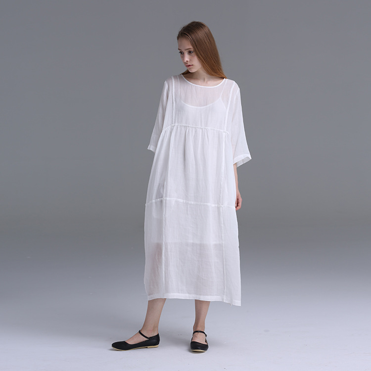 原創女裝初心春夏新款棉麻亞麻優雅圓領寬松插袋簡潔設計連衣裙 /