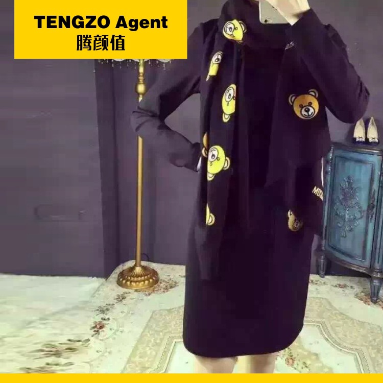 韓版小熊刺繡口袋套頭羅馬棉連衣裙配印花圍巾 工廠直銷商場貨色 /
