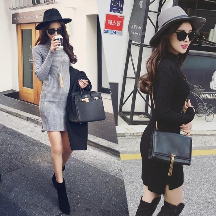 2015冬裝新款歐美裙擺開叉修身長袖半高領針織連衣裙 /