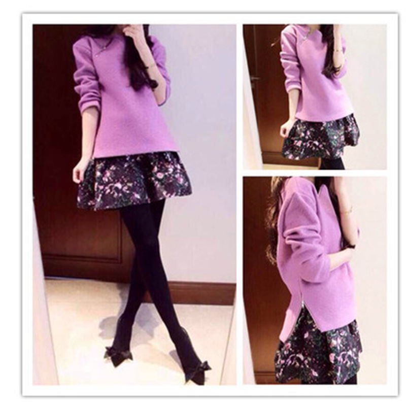 批發2015秋冬韓版新款女大碼毛呢兩件套l連衣裙長袖修身長袖套裝 /