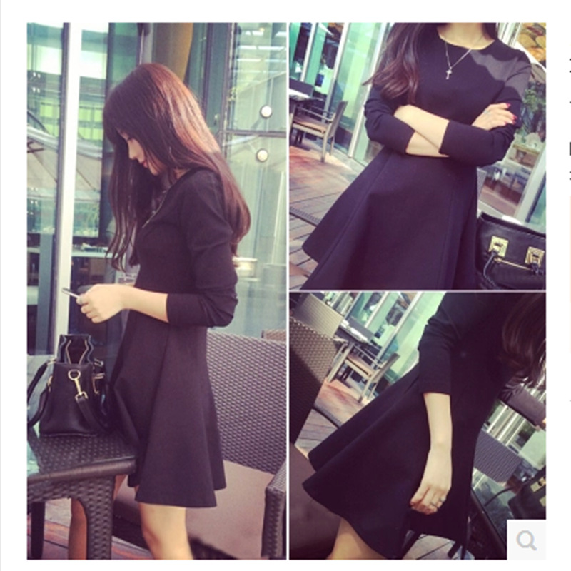 2015秋冬新款赫本小黑裙長袖大碼打底裙圓領修身顯瘦蓬蓬連衣裙女 /