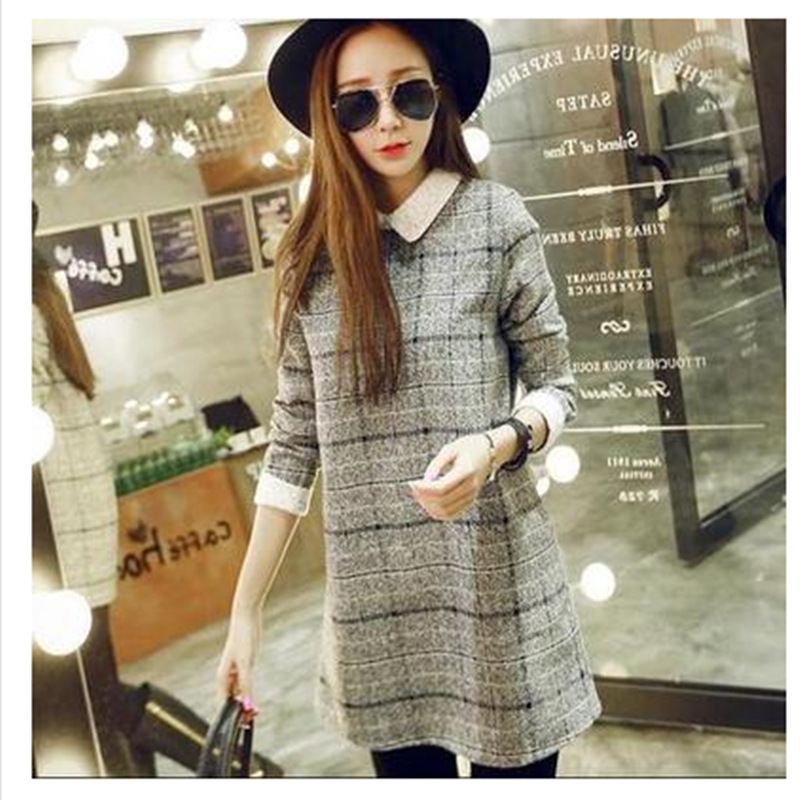 批發2015秋冬新款女韓版娃娃領修身大碼長袖格子毛呢連衣裙打底裙 /