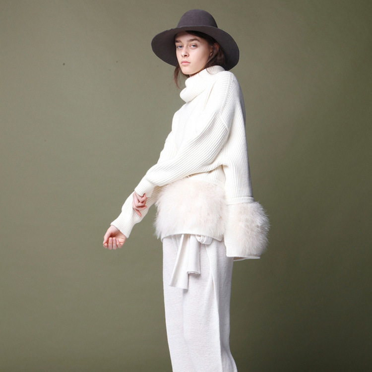 2015冬季女裝新款日式火雞毛皮草毛毛拼接套頭毛衣 批發 /