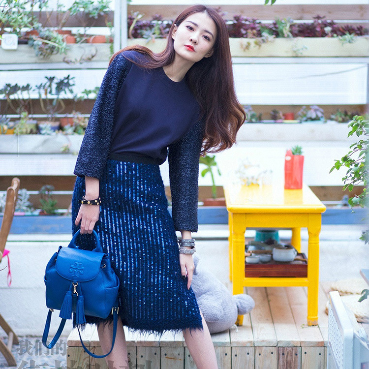 徐璐同款藍色金屬絲絨套頭上衣衛衣+藍色亮片羊毛鉛筆裙半裙 套裝 /