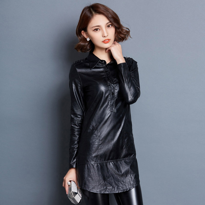歐美大牌2015秋冬新款韓版翻領修身顯瘦PU皮衣女長袖中長款打底衫 /