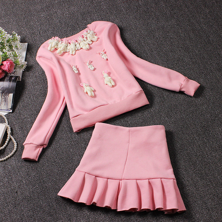 實拍立體兔子裝飾名媛小香風衛衣抓絨套裝 /
