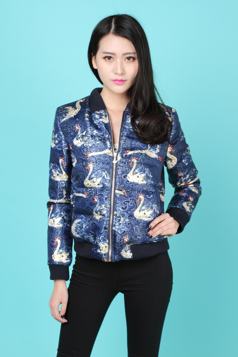新款歐洲站棉衣深藍印花圖案加厚棉服女短款潮流女棉衣女式棉服 /