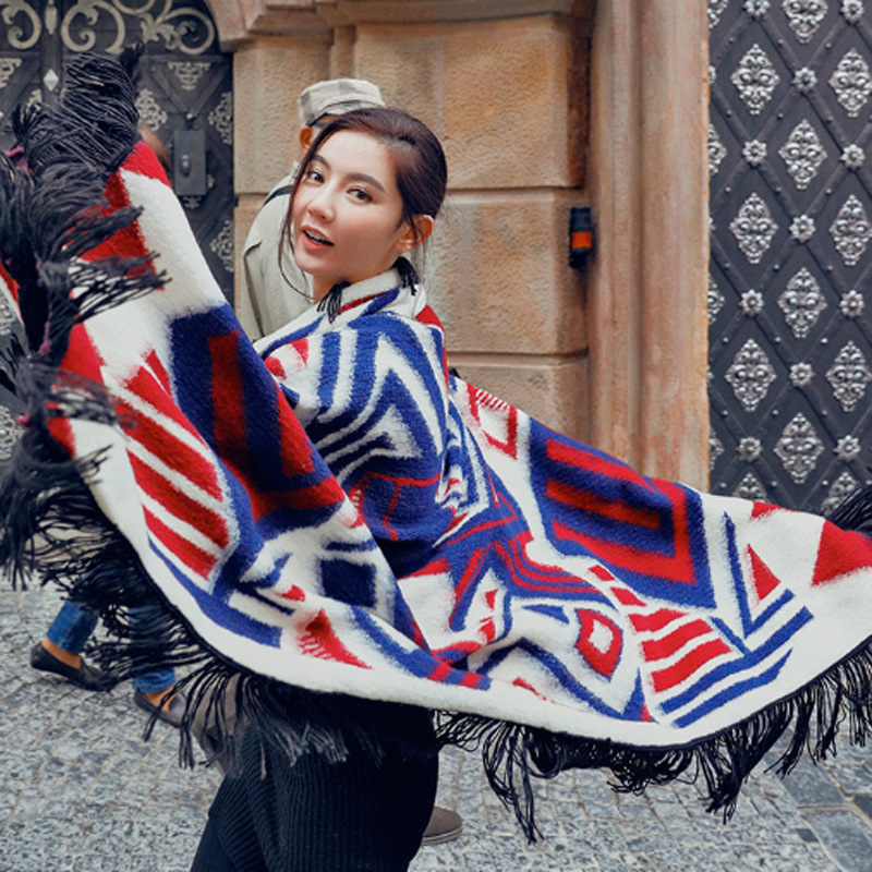 2015新款原創撞色抽象幾何圖形羊毛披肩流蘇款毛毯保暖羊毛方毯 /