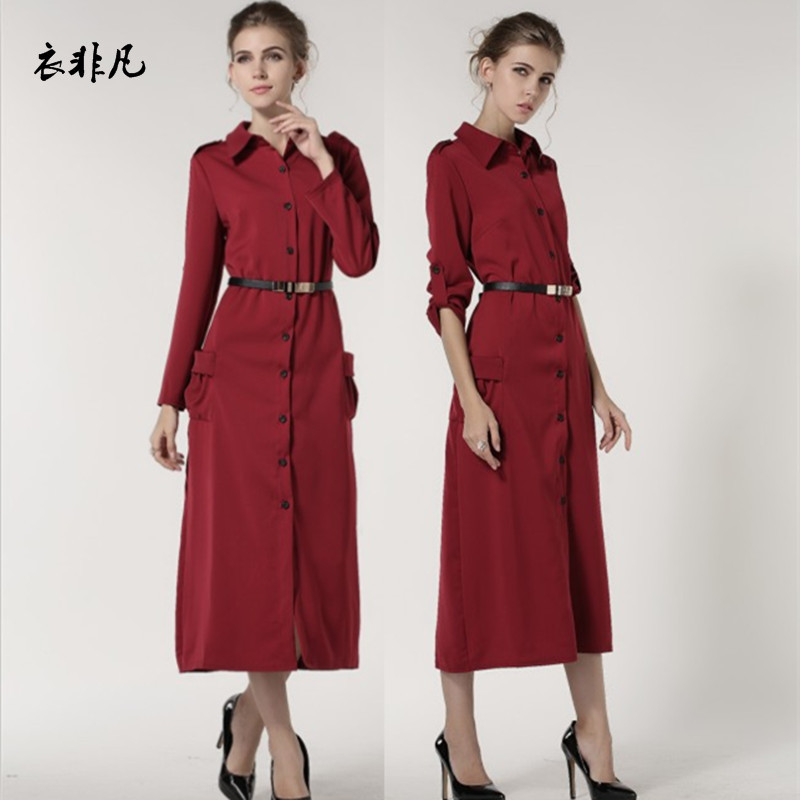 2015穆斯林服裝新款歐美長排扣兩袖穿法修身連衣裙帶腰帶可代發女 /