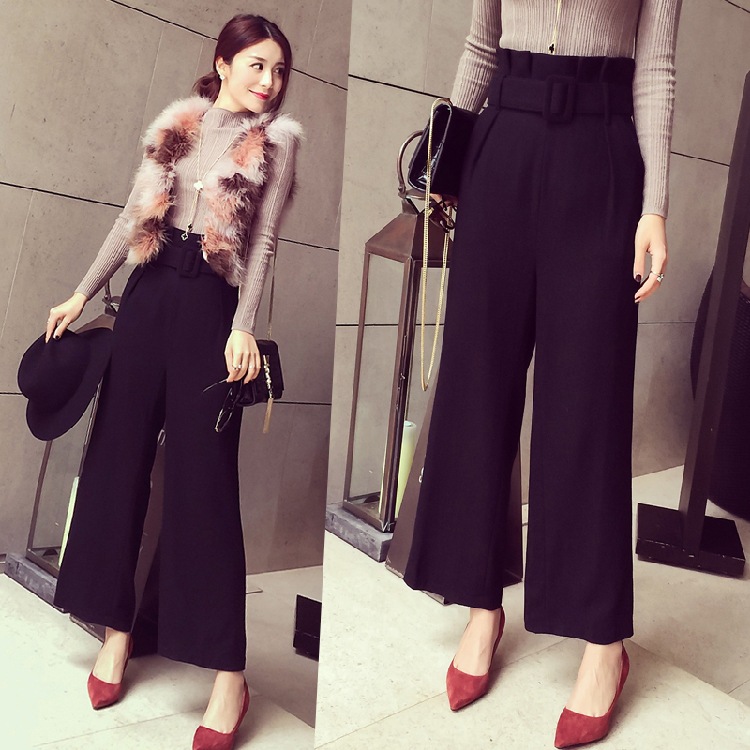 高腰寬腿褲女2015女士休閑褲秋冬呢子花苞羊毛呢闊腿褲長褲送腰帶 /