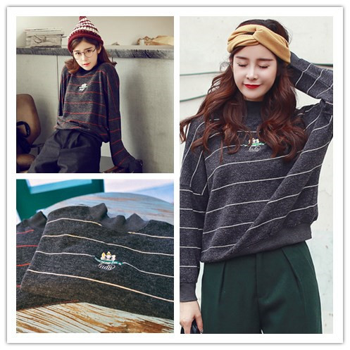 2015秋冬原創(chuàng)復古BF學院細條紋兔毛刺繡針織衫 長袖打底毛衣 /