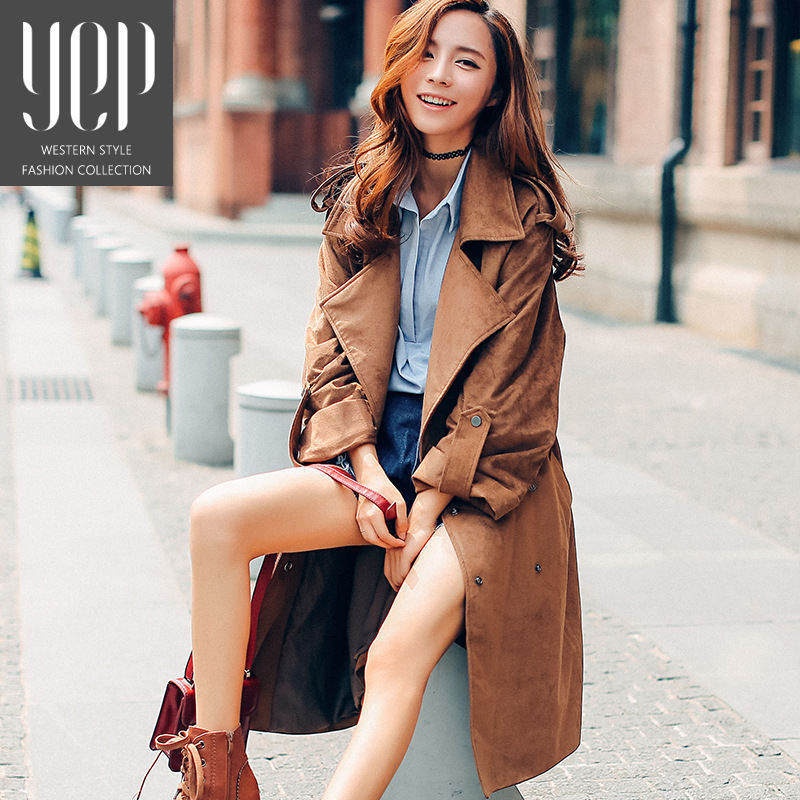 YEP2015冬裝新品歐美寬松大碼廓形長款麂皮絨風衣長袖大衣外套女 /