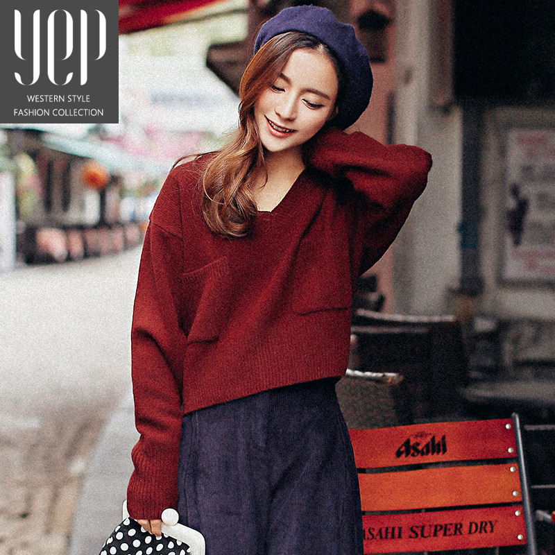 YEP2015冬裝新品韓版酒紅色口袋套頭針織衫V領毛衣女式打底短款 /