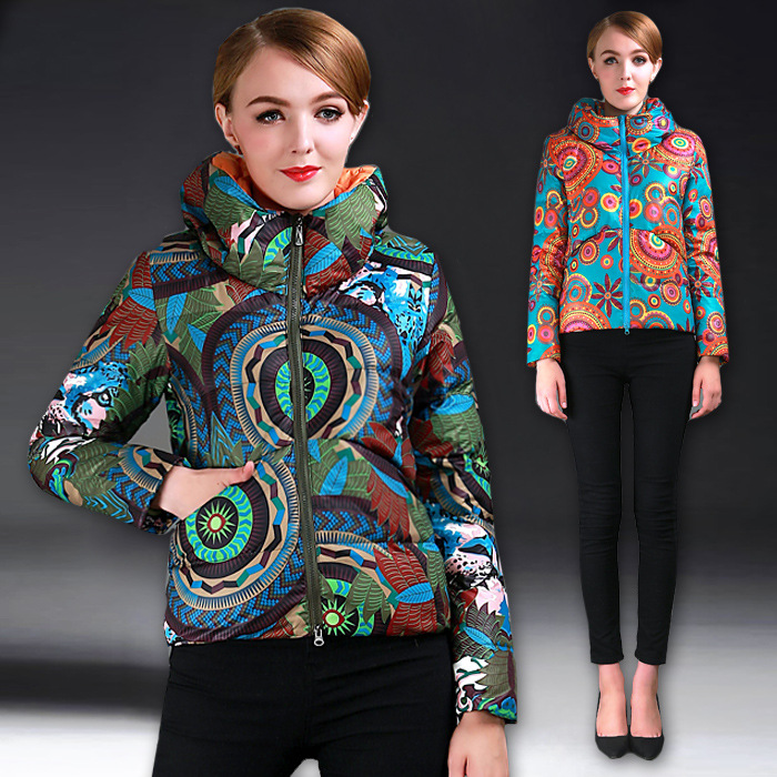 2015新款韓版休閑歐美民族風印花連帽羽絨服女短款枕頭領大碼潮 /