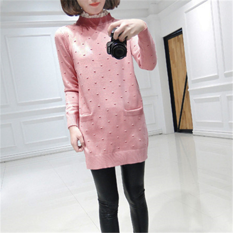 韓版2015秋冬新款長袖蕾絲半高領(lǐng)中長款針織衫毛衣打底衫廠家直銷 /