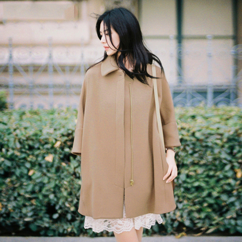 2015秋裝新款女裝 歐美風(fēng)駝色毛呢外套女 A字型寬松一粒扣呢大衣 /