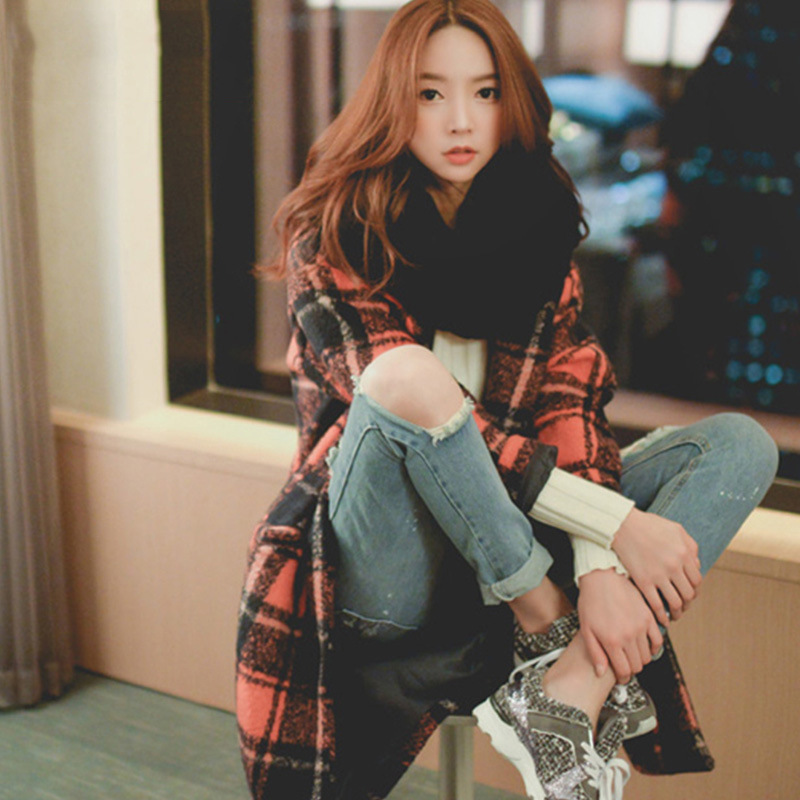 毛呢外套 2015冬季新款女裝橘色格子毛呢大衣韓版秋冬女裝批發(fā) /