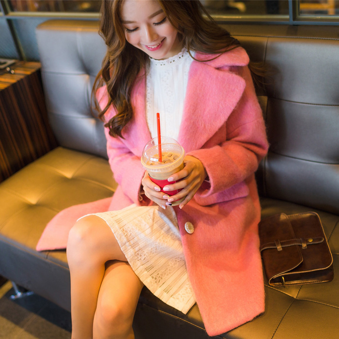 2015秋冬新款毛呢外套甜美粉色長(zhǎng)款羊毛大衣代理批發(fā) /