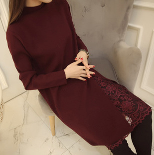 2015新款韓版長款毛衣連衣裙半高領套頭下開叉蕾絲下擺女款 /