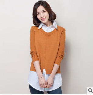 2015秋裝韓版襯衫領拼接假兩件套衫修身套頭下擺毛衣針織衫女 /