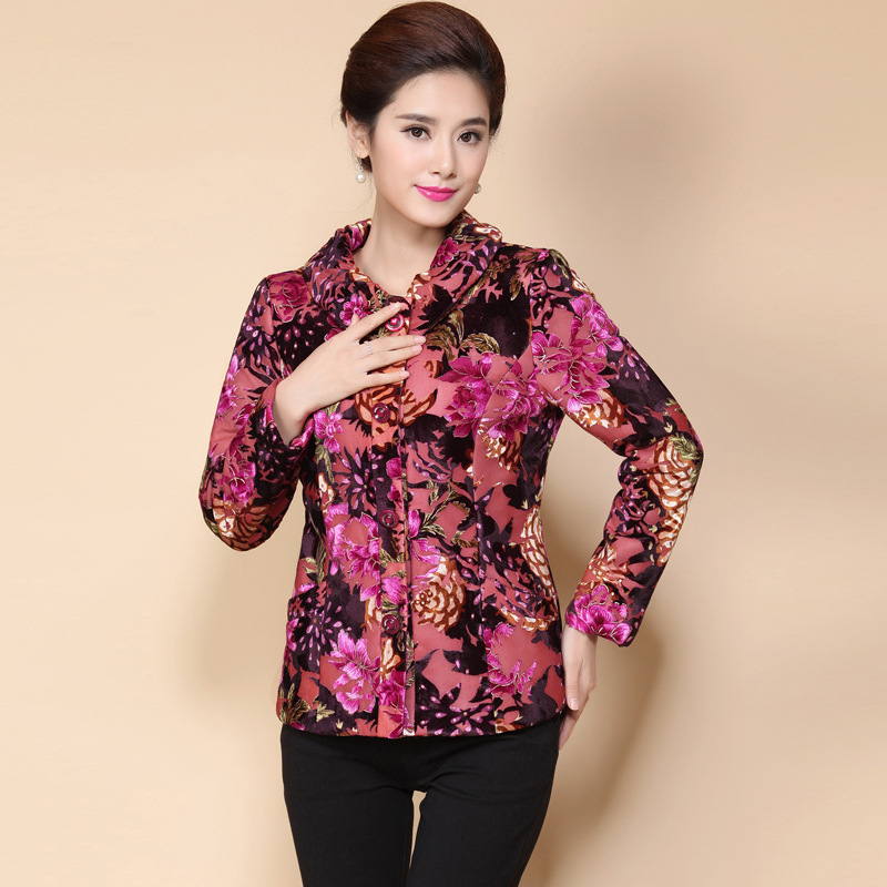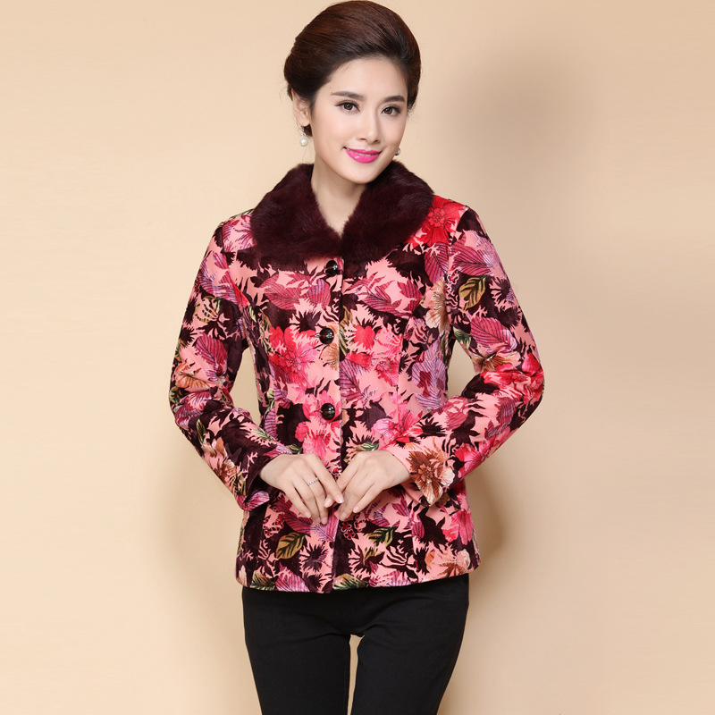 秋冬季玫瑰花帶扣媽媽女裝 毛領翻領中老年棉衣外套批發供應 /