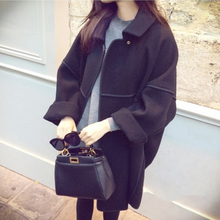 2015秋冬風衣斗篷式翻領繭形中長款加厚毛呢子大碼廓形外套大衣女 /