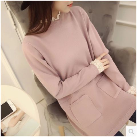 針織衫女秋冬新款韓版時尚修身簡約蕾絲拼接中長款套頭毛衣上衣女 /