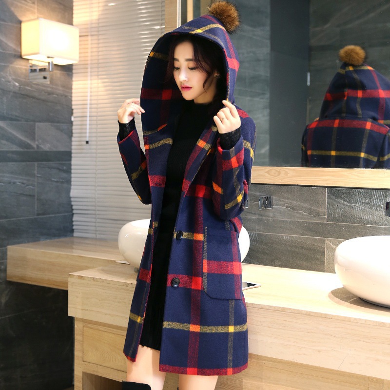 格子毛呢外套2015秋冬裝韓版中長款時尚修身收腰冬裝帶帽呢大衣女 /